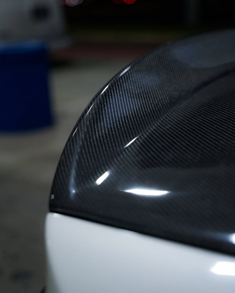 CMST Tuning uses Grade A one-piece carbon fiber sheets with a Fiberglass Reinforced Plastic (FRP) skeleton for strength and durability (except on dry carbon products, since it is not needed). Because CMST Tuning uses one-piece sheets, so you will not see any broken lines or patterns. Rather, all you will notice is just one big consistent weave pattern. In addition to this, all CMST Tuning products use a strong clear coat finish. Clear coats are shiny and durable, and they give you the nice "wet" look as opposed to a duller look from gel coats. Lastly, all of CMST Tuning's carbon sheets are built into the mold, so they do not break and split like the ones where carbon is only wrapped around the skeleton.