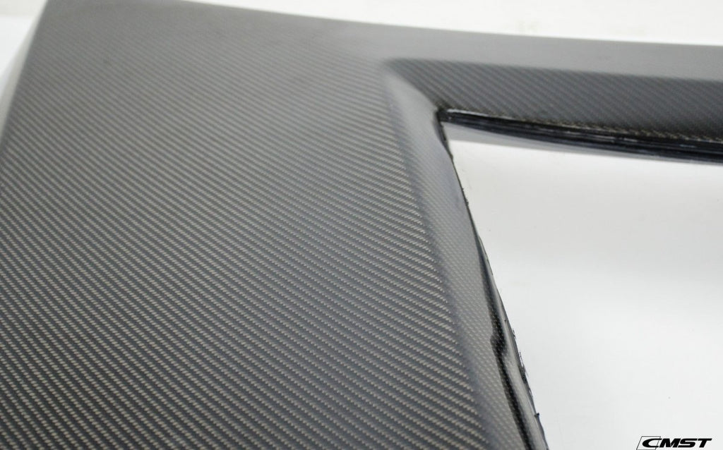 CMST Tuning uses Grade A one-piece carbon fiber sheets with a Fiberglass Reinforced Plastic (FRP) skeleton for strength and durability (except on dry carbon products, since it is not needed). Because CMST Tuning uses one-piece sheets, so you will not see any broken lines or patterns. Rather, all you will notice is just one big consistent weave pattern. In addition to this, all CMST Tuning products use a strong clear coat finish. Clear coats are shiny and durable, and they give you the nice "wet" look as opposed to a duller look from gel coats. Lastly, all of CMST Tuning's carbon sheets are built into the mold, so they do not break and split like the ones where carbon is only wrapped around the skeleton.